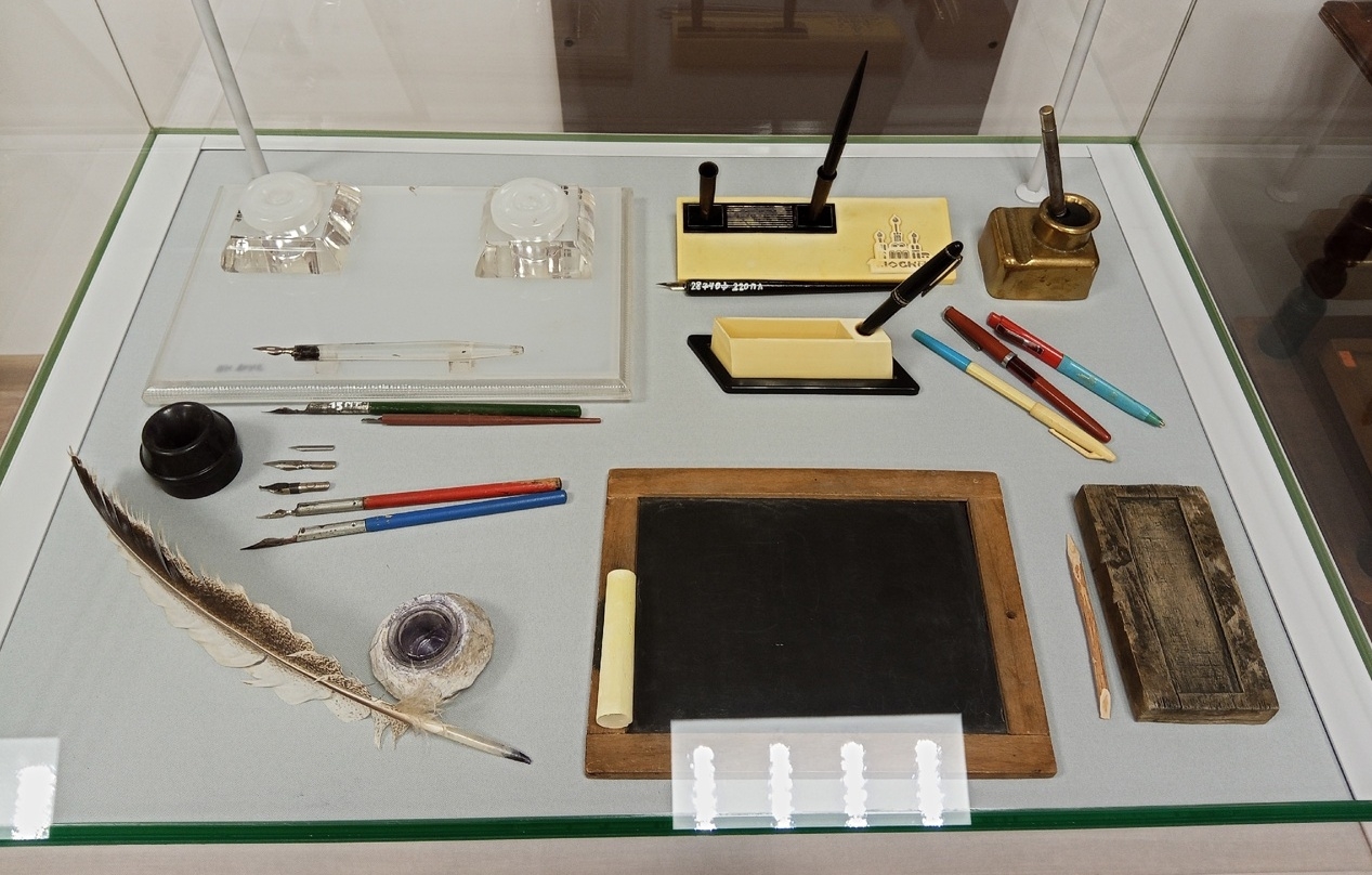 На выставке можно увидеть предметы для письма, которыми люди пользовались в разные времена: гусиные перья, металлические перьевые ручки, шариковые авторучки. Также на выставке представлены всевозможные механические и электронные устройства для арифметических вычислений: от традиционных счетов до арифмометров ХIХ–ХХ веков и современных калькуляторов.
