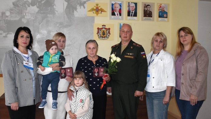 Военный комиссар Рыбновского района Сергей Кравченко передал награды матери Альвина Александровича и супруге Николая Викторовича.