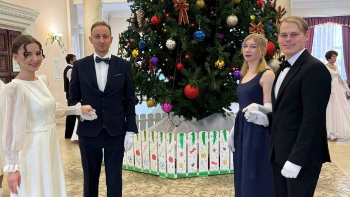 Зимний бал не может обойтись без Золушки… и все с удовольствием приняли участие в контрдансе с таким названием, а участники студии танца «Полет души» во главе с ведущей бала Ириной Валерьевной показали мазурку «Нева».